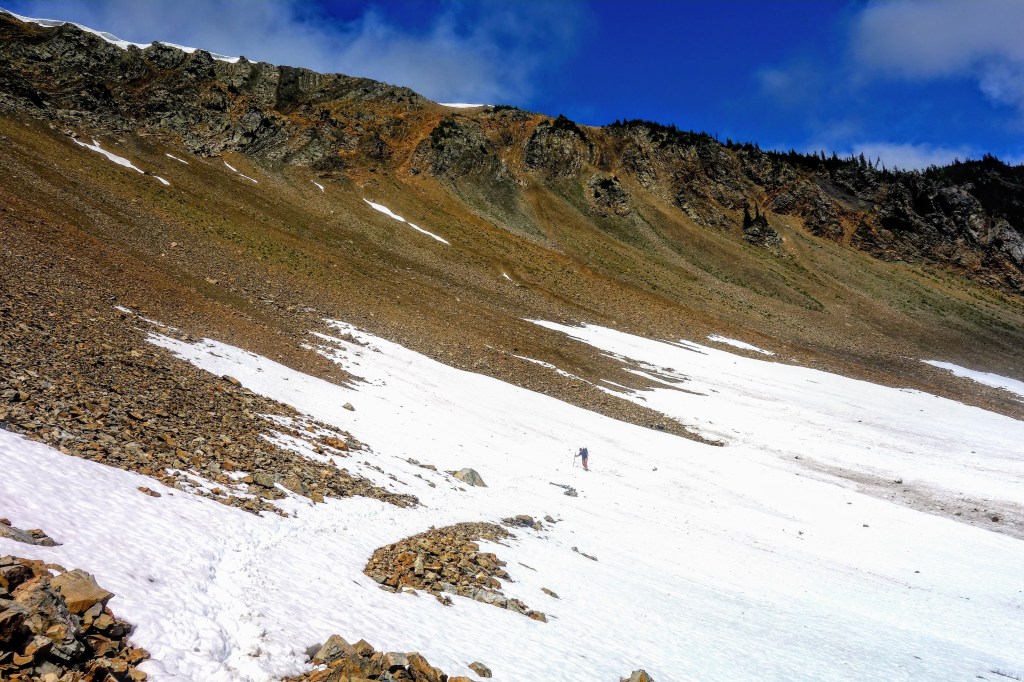 I get to another snow field now. As I carefully pick spots where my feet won’t slip, I realize this sprain is as bad as I initially thought.