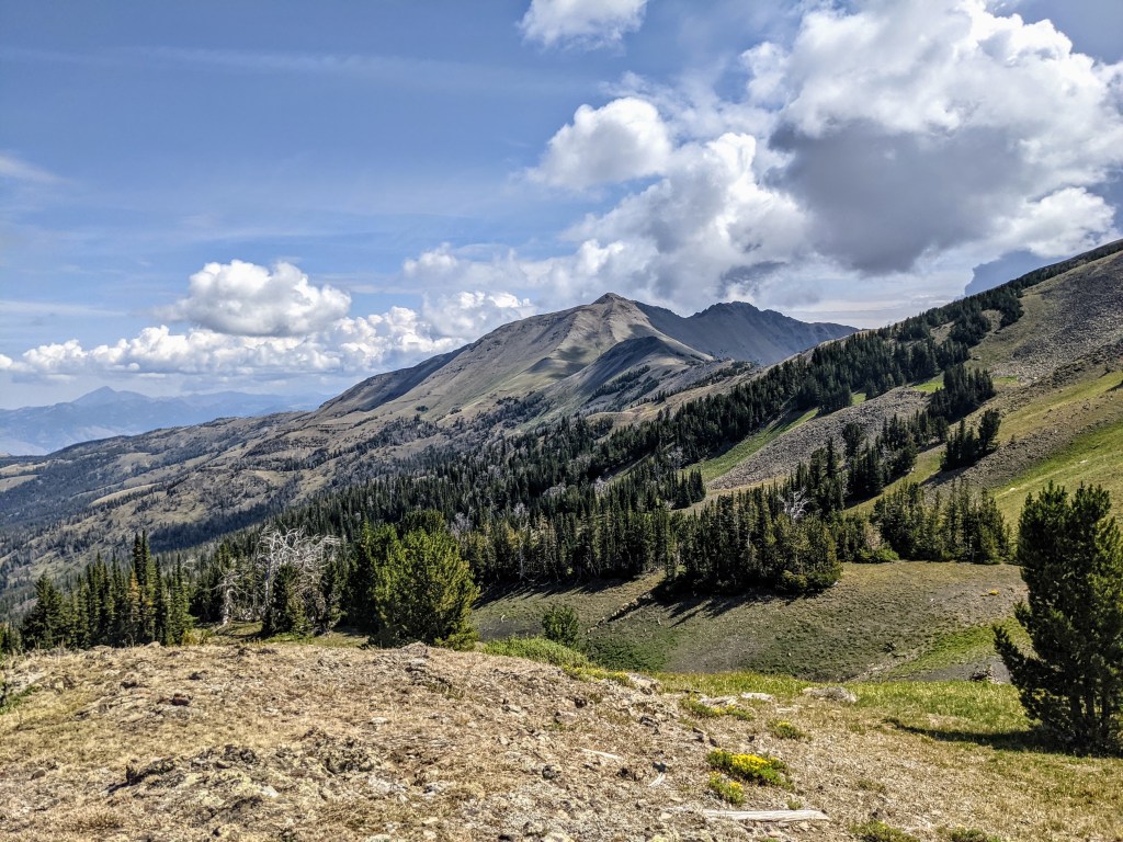 Just outside of Yellowstone I slept on top of a pass. For some reason that evening I was particularly choosy about selecting a good campsite. I walked a mile or so along that high meadow, looking for a spot with coverage from the inevitable wind and away from dead trees. There were a lot of dead trees up there, but I eventually found a nice spot tucked under some very alive pine trees.