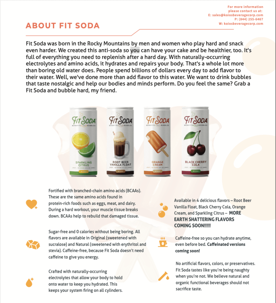 Fit Soda Product Descriptions for Koios Beverage Corp.